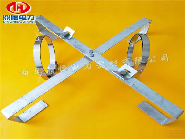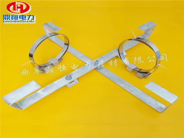 1、桿用余纜架由2套電力鋼帶抱箍固定在電線桿處;